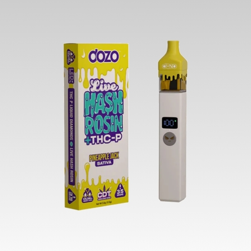 Vape desechable Dozo Hash Rosin 3.5 gr, lleno de live hash rosin, THC‑A (y en algunas versiones THC‑P), sabores por strain, potente y listo para usar sin complicaciones.